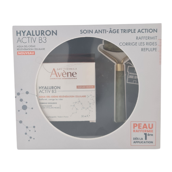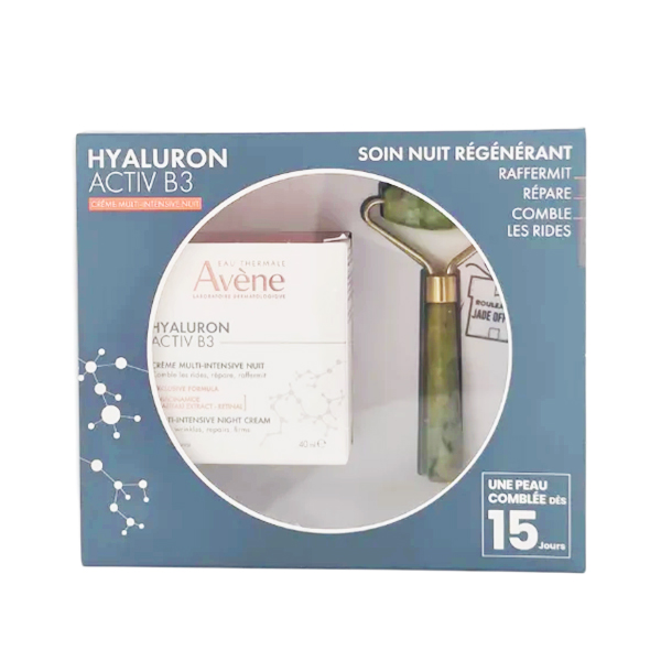 Pack AVENE Hyaluron Activ B3 Crème Nuit Anti-Rides 40ml + Rouleau en Jade offert. Cette crème enrichie en rétinal et acide hyaluronique agit sur les signes du vieillissement, répare et défroisse la peau dès le réveil.