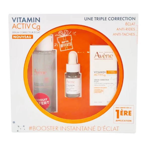 Pack soin anti-âge et éclat comprenant le Sérum Avène Hyaluron Activ B3 Tunisie (30ml), l'Eau Micellaire (100ml) et un Sérum Vitamin Cg (10ml) offerts. Ce trio lutte contre les rides, repulpe la peau et ravive son éclat, tout en nettoyant et hydratant en profondeur.
