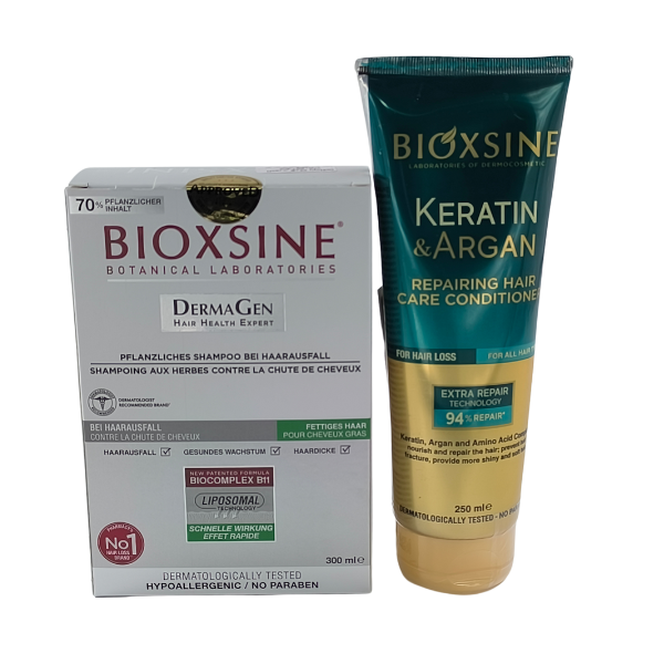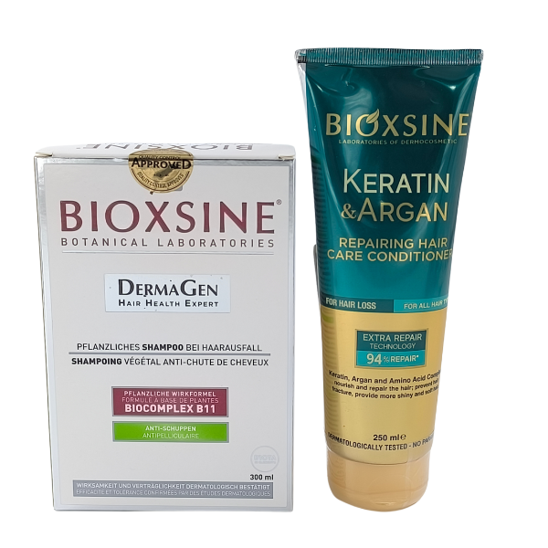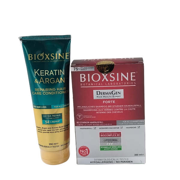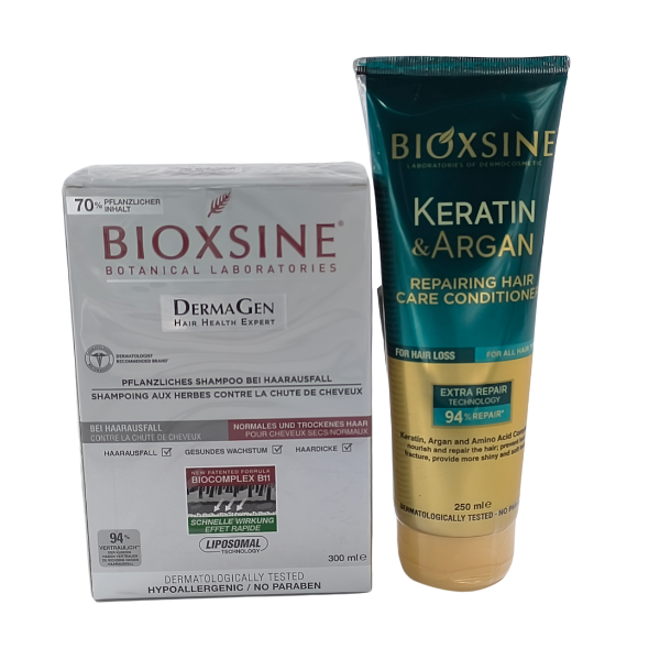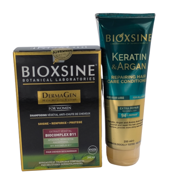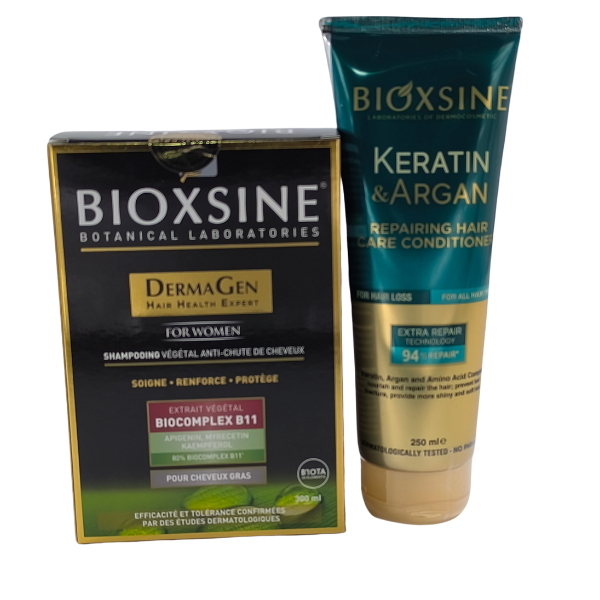 Le shampooing Bioxsine Dermagen a été développé pour les personnes souffrant de chute de cheveux + Aprés shampooing bioxsine :nourrit, répare et hydrate les cheveux abîmés qui ont perdu leur brillance et leur hydratation grâce à sa kératine hydrolysée et son huile d'argan.
