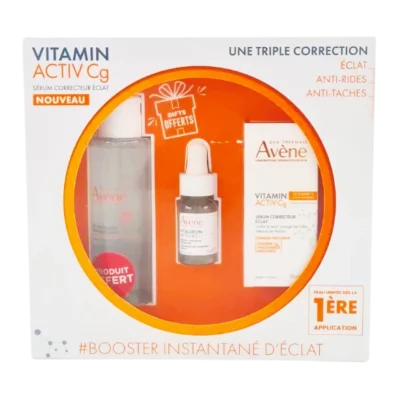 Pack soin anti-âge et éclat comprenant le Sérum Avène Vitamin Cg (30ml), l’Eau Micellaire (100ml) et un Sérum activ B3 (10ml) offerts. Ce trio lutte contre les rides, repulpe la peau et ravive l’éclat, tout en nettoyant et hydratant votre peau en profondeu