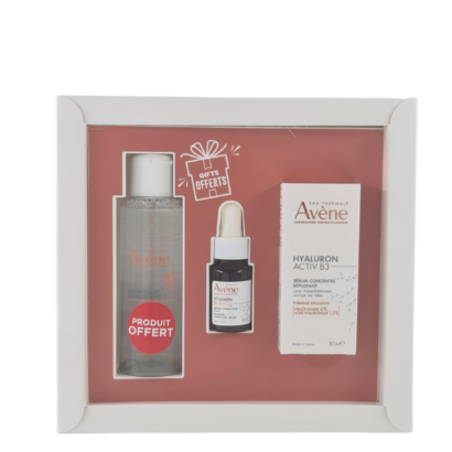 Pack soin anti-âge et éclat comprenant le Sérum Avène Hyaluron Activ B3 Tunisie (30ml), l’Eau Micellaire (100ml) et un Sérum Vitamin Cg (10ml) offerts. Ce trio lutte contre les rides, repulpe la peau et ravive son éclat, tout en nettoyant et hydratant en profondeur.